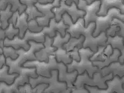 La epidermis vegetal consta de tres tipos principales de células: células del pavimento, células de guarda y sus células subsidiarias que rodean los estomas y los tricomas, también conocidos como pelos de las hojas. La epidermis de los pétalos también forma una variación de tricomas denominadas células cónicas.[2]