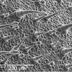 Los tricomas o pelos crecen hacia fuera desde la epidermis en muchas especies. En la epidermis radical, los pelos epidérmicos, llamados pelos radicales, son muy comunes y se especializan en la absorción de agua y nutrientes minerales.