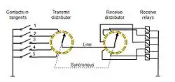 En el extremo de recepción, otro distribuidor similar estaba conectado a varias impresoras, que imprimían las letras, números y signos del alfabeto correspondientes en tiras de papel, que luego se cortaban y pegaban en una hoja de papel.[23]