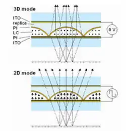 - Lentes de LC (cristal líquido) permiten desactivar el efecto de las lentes. Con lentes de LC en modo 2D, todos los píxeles contribuyen en una única imagen de alta resolución. Este proceso ha sido patentado por PHILIPS 3D Solutions[4] y consiste en variar el índice de refracción de las lentes. La capa de lentes se llena de cristal líquido y de esta manera tienen un índice de refracción diferente que permite el modo 3D. Para cambiar al modo 2D, se aplica una carga eléctrica sobre el cristal líquido para alterar su índice de refracción y como resultado se consigue que no refracte la luz que pasa a través de él.