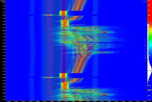 - ↑ La modulación de la señal de RF se invierte en comparación con la AM convencional: el nivel mínimo de la señal de vídeo corresponde a la amplitud máxima de la portadora, y viceversa.