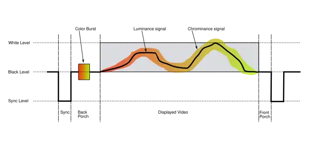 Cada línea de la imagen visualizada se transmite mediante una señal como la que se muestra arriba. El mismo formato básico (con pequeñas diferencias relacionadas principalmente con la temporización y la codificación del color) se utiliza para los sistemas de televisión PAL, NTSC y SECAM. Una señal monocroma es idéntica a una en color, con la excepción de que los elementos mostrados en color en el diagrama (la ráfaga de color y la señal de crominancia) no están presentes.