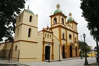 adosadas. Remata esta fachada tres aberturas para las campanas. La torre de tres cuerpos está cubierta por una cúpula de media naranja. En las fachadas laterales pueden verse contrafuertes y tres ventanas en cada una. En 1983 la iglesia fue restaurada por el Ministerio del Desarrollo Urbano, Mindur, bajo la responsabilidad del maestro Antonio Martín Porras.[4]