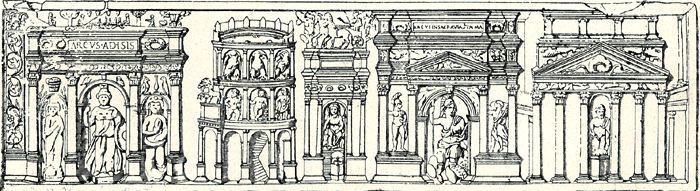 - ↑ Castagnoli, "Gli edifici rappresentati in un rilievo del sepolcro degli Haterii", p. 65