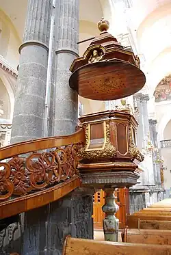 Las torres, al igual que la fachada, están construidas en piedra y argamasa y decoradas con yeserías. En su interior, la iglesia presenta tres naves de planta de salón, a la misma altura, que plantea grandes espacios diáfanos y bien iluminados. El crucero se cubre con cúpula sobre tambor siguiendo la tradición del modelo jesuítico de Vingola.[3]