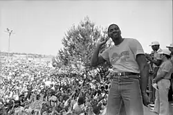Magic Johnson bromeando con la afición en la concentración por el Campeonato Mundial de los Lakers en el Forum de Inglewood, California, el 12 de junio de 1985