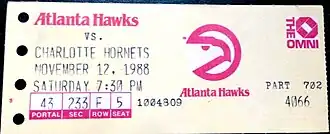 Entrada para un partido entre los Hawks y los Charlotte Hornets en noviembre de 1988.