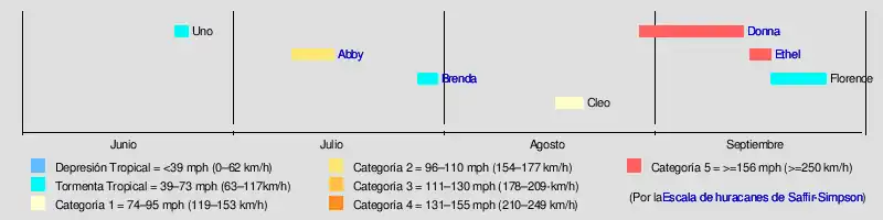 La tormenta más notable de la temporada fue el Donna, que alcanzó categoría 5 en la escala Saffir-Simpson y fue el huracán mayor de más duración en la historia de la cuenca del Atlántico. Fue la peor tormenta que azotó Florida en diez años, causando seis muertes directas, y causando 387 millones dólares en daños (2400 millones de dólares del 2000).