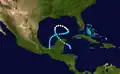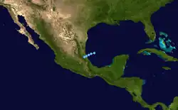 Un área de baja presión se convirtió en una depresión tropical mientras estaba ubicada a unas 75 millas (120 km) al noreste de Guanaja en el Departamento de Islas de la Bahía de Honduras. Aunque las condiciones eran favorables para una rápida profundización, la depresión no lo hizo porque no estaba apilada verticalmente y golpeó la península de Yucatán a última hora del 18 de octubre. Después de emerger al Golfo de México al día siguiente, el sistema se fortaleció hasta convertirse en la tormenta tropical Laurie. Más tarde, el 19 de octubre, Laurie curvó hacia el norte y continuó intensificándose. A las 18:00 UTC del 20 de octubre, la tormenta se convirtió en huracán. Luego se curvó hacia el este sobre el centro del Golfo de México y continuó profundizándose, alcanzando un máximo de huracán de categoría 1 con vientos sostenidos de 90 mph (150 km/h) y una presión barométrica mínima de 973 mbar (28,7 inHg). A partir de entonces, el aire más seco comenzó a debilitar a Laurie el 22 de octubre. Laurie curvó hacia el sureste y luego hacia el sur, lo que le permitió permanecer lejos de la costa del Golfo de los Estados Unidos.