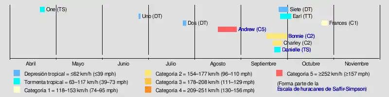 La temporada de huracanes del Atlántico comenzó oficialmente el 1 de junio,[7] pero la actividad comenzó más de un mes antes con la formación de la tormenta subtropical Uno el 21 de abril. Fue una temporada por debajo del promedio, en la que se formaron diez depresiones tropicales o subtropicales. Siete de estas depresiones alcanzaron la categoría de tormenta tropical y cuatro de ellas, la de huracán. Además, un ciclón tropical alcanzó finalmente la categoría de huracán mayor,[8] lo cual está por debajo del promedio de 2,7 por temporada entre 1981 y 2010.[6] La baja cantidad de actividad se atribuye en parte a ondas tropicales más débiles de lo normal, la fuente de la mayoría de los ciclones tropicales del Atlántico Norte.[9] Solo dos huracanes y una tormenta tropical tocaron tierra durante la temporada. Sin embargo, los daños causados por el huracán Andrew fueron astronómicos, causando la mayoría de las 73 muertes y los 27.300 millones de dólares (USD 1992) en daños de la temporada.[8][10][11][12][13][14]