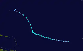 - ↑ a b c d Edward N. Rappaport (2 de noviembre de 2000), «Preliminary Report: Hurricane Iris» (PDF), National Hurricane Center (Miami, Florida: National Oceanic and Atmospheric Administration), consultado el 2 de junio de 2025.