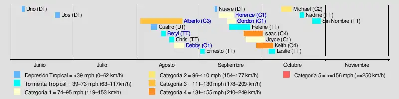 La tormenta más impactante de la temporada fue el Huracán Keith, el dejó varios fallecidos y produjo grandes daños en Belice, Nicaragua y Honduras. Su precursor la tormenta tropical Leslie proudujo severas inundaciones en el sur de Florida, causando casi 1000 millones (USD) en daños. Adicionalmente, el Huracán Alberto se convirtió en uno de los ciclones tropicales más duraderos del Atlántico.