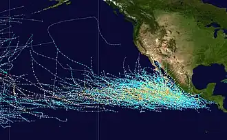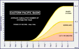 Esta área es, en promedio, la segunda cuenca más activa del mundo. Hay un promedio de 16 tormentas tropicales por año, de las cuales 9 se convierten en huracanes y 4 se convierten en huracanes mayores.[7] Los ciclones tropicales en esta región frecuentemente afectan el territorio continental de México y las islas Revillagigedo. Con menos frecuencia, un sistema afectará a los Estados Unidos continentales o América Central. Los huracanes en dirección norte generalmente se reducen a tormentas tropicales o se disipan antes de llegar a los Estados Unidos: solo hay un caso registrado de un sistema del Pacífico que llega a California como huracán en casi 200 años de observaciones: el Huracán de San Diego de 1858.[8]