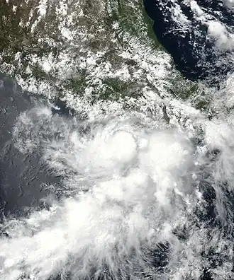 A principios de mayo, un canal de rastreo hacia el oeste o una onda tropical incrustada en el canal del monzón interactuó con una onda kelvin acoplada convectivamente, lo que llevó a una gran área de actividad de lluvia y tormenta al suroeste de México.[8] El 7 de mayo, el Centro Nacional de Huracanes emitió un pronóstico especial señalando un potencial medio para la formación de ciclones tropicales en los próximos cinco días.[9] La perturbación se organizó durante los dos días siguientes, pero carecía de un centro bien definido necesario para la clasificación;[10] a última hora del 9 de mayo, las condiciones ambientales se estaban volviendo menos favorables para el desarrollo.[11] A las 21:00 UTC del 10 de mayo, sin embargo, un aumento en la convección y la formación de una circulación bien definida llevaron a la designación de la primera depresión tropical de la temporada.[12] El sistema no se intensificó después de la formación y, debido a la fuerte cizalladura del viento del oeste, finalmente se degeneró en una baja remanente a las 03:00 UTC del 12 de mayo.[13]