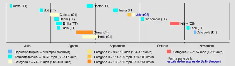 La temporada comenzó inusualmente tranquila, con varias semanas de inactividad en toda la cuenca. El primer sistema, la tormenta tropical Aletta, de corta duración, se formó el 4 de julio, lo que la convirtió en el último ciclón tropical del Pacífico con nombre en formarse en la era de los satélites. Le siguió casi tres semanas después la tormenta tropical Bud. Una semana después, el 31 de julio, el huracán Carlotta se formó a partir de un área de baja presión y luego se convirtió en el primer huracán de la temporada. Tres tormentas más se formaron en rápida sucesión durante la primera semana de agosto: Daniel, Emilia y Fabio. Después de una pausa en la actividad, la ciclogénesis tropical se reanudó a fines de agosto con la formación del huracán Gilma el 18 de agosto.[10] Gilma se convirtió en el primer gran huracán de la temporada el 22 de agosto. El huracán Hone también se desarrolló en la cuenca del Pacífico central el 22 de agosto, convirtiéndose en el primer ciclón tropical que se forma en esa cuenca en cinco años.[3] A ellos se unió la tormenta tropical Héctor el 25 de agosto en el Pacífico oriental.[11] Más tarde, Hone se desplazaría fuera de la cuenca hacia el Pacífico occidental. Hone y Gilma fueron los únicos ciclones tropicales del Pacífico central este año. Más tarde, Hone se desplazaría fuera de la cuenca hacia el Pacífico occidental. Hone y Gilma fueron los únicos ciclones tropicales del Pacífico central este año.[12]