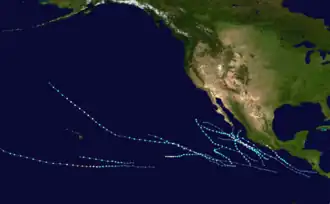 Antes de cada temporada de huracanes en el Pacífico, la Oficina Nacional de Administración Oceánica y Atmosférica de los Estados Unidos (NOAA) y el Servicio Meteorológico Nacional (SMN) de México emiten pronósticos de la actividad de los huracanes. Estos incluyen cambios semanales y mensuales en factores importantes que ayudan a determinar la cantidad de tormentas tropicales, huracanes[nb 2] y huracanes mayores[nb 3][nb 4] dentro de un año en particular. Según la Oficina Nacional de Administración Oceánica y Atmosférica de los Estados Unidos (NOAA), la temporada promedio de huracanes en el Pacífico oriental entre 1991 y 2020 contuvo aproximadamente 15 tormentas tropicales, 8 huracanes, 4 huracanes mayores, con un índice de Energía Ciclónica Acumulada (ACE) casi normal entre 80 y 115.[3] En términos generales, ACE es una medida del poder de una tormenta tropical o subtropical multiplicado por el tiempo que existió. Solo se calcula para avisos completos sobre sistemas tropicales y subtropicales específicos que alcanzan o superan velocidades de viento de 39 mph (63 km/h). El Oficina Nacional de Administración Oceánica y Atmosférica (NOAA) normalmente clasifica una temporada como superior al promedio, promedio o inferior al promedio según el índice ACE acumulativo, pero a veces también se considera la cantidad de tormentas tropicales, huracanes y huracanes importantes dentro de una temporada de huracanes.[3]