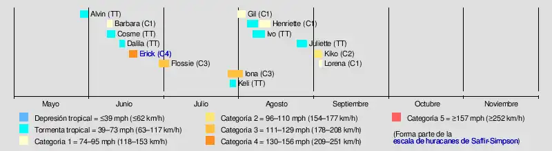 A diferencia de la temporada anterior, que tuvo un comienzo lento récord (la tormenta tropical Aletta se formó el 4 de julio), este año hubo una oleada de actividad a principios de temporada.[2] La tormenta tropical Alvin se formó frente a la costa sur de México el 28 de mayo y permaneció sobre las aguas abiertas del Pacífico oriental. Se formaron cinco tormentas en un período de diez días, del 8 al 28 de junio, incluido el huracán Bárbara, la tormenta tropical Cosme y la tormenta tropical Dalila, ambos rozando la costa suroeste de México, y el huracán Erick, la quinta tormenta nombrada más temprana registrada en el Pacífico oriental y el primer huracán mayor en tocar tierra en cualquiera de las costas de México (Pacífico o Atlántico). Erick causó al menos 205 millones de dólares en daños en el suroeste de México y provocó 23 muertos.[nb 1] Le siguió el huracán Flossie, que pasó cerca de la costa suroeste de México, provocando inundaciones y daños materiales. A fines de julio, el huracán Iona, el primer sistema del Pacífico central de la temporada, también se convirtió en un huracán mayor.