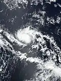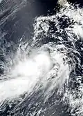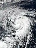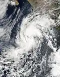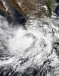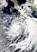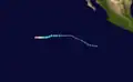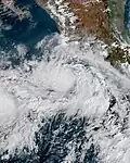 El 6 de junio de 2025, se formó una amplia zona de baja presión a lo largo del lado occidental de una vaguada alargada al sur de México.[47] Las lluvias y tormentas eléctricas asociadas con la baja presión se organizaron considerablemente mejor a principios del 8 de junio, lo que resultó en la formación de la depresión tropical Tres-E.[48] Moviéndose lentamente hacia el noroeste, el sistema pronto se fortaleció y se convirtió en la tormenta tropical Cosme.[49] Cosme continuó intensificándose y en la tarde del 9 de junio ya se acercaba a la fuerza de huracán, con vientos sostenidos de 110 km/h (70 mph).[50] Sin embargo, un fortalecimiento adicional fue sofocado y Cosme comenzó a debilitarse a la mañana siguiente, debido a los efectos de la cizalladura moderada del viento del noreste.[51] Finalmente, cesó toda convección profunda y la tormenta degeneró en un área de baja presión remanente a primeras horas del 11 de junio.[52][53]