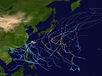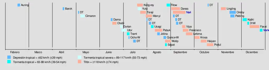 Sin embargo, la primera tormenta nombrada, Cimaron, no se desarrolló hasta el 9 de mayo. Taiwán sufrió la mayor destrucción por los tifones este año, siendo los tifones Toraji, Nari y Lekima responsables de casi 300 muertes solo en esa isla, lo que la convierte en una de las más temporadas de tifones más mortíferas en la historia registrada en esa isla. En noviembre, el tifón Lingling azotó Filipinas y mató a 171 personas, lo que la convirtió en una de las tormentas filipinas más mortíferas de este siglo. La temporada terminó con la formación de la tormenta tropical Vamei durante la última semana de diciembre. Vamei se destacó por convertirse en el tifón de latitud más baja, a 1,5°N, jamás observado en el noroeste del Pacífico.[2]