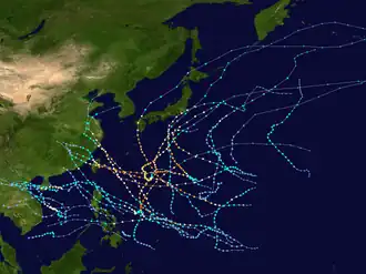 Dentro del Océano Pacífico Noroccidental, tanto la Agencia Meteorológica de Japón (JMA) como la Administración de Servicios Atmosféricos, Geofísicos y Astronómicos de Filipinas (PAGASA) asignan nombres a los ciclones tropicales que se desarrollan en el Pacífico Occidental, lo que puede dar como resultado que un ciclón tropical tenga dos nombres.[16] El Centro de Tifones RSMC Tokio de la Agencia Meteorológica de Japón asigna nombres internacionales a los ciclones tropicales en nombre del Comité de Tifones de la Organización Meteorológica Mundial (OMM), en caso de que se juzgue que tienen una velocidad del viento sostenida de 10 minutos de 65 km/h (40 mph).[17] PAGASA nombra a los ciclones tropicales que se mueven o forman una depresión tropical en su área de responsabilidad ubicada entre 135°E y 115°E y entre 5°N y 25°N, incluso si el ciclón tiene un nombre internacional asignado.[16] Los nombres de ciclones tropicales significativos son retirados, tanto por PAGASA como por el Comité de Tifones.[17] Si la lista de nombres para la región de Filipinas se agota, los nombres se tomarán de una lista auxiliar de los cuales se publican los primeros diez cada temporada. Los nombres no utilizados están marcados en gris.