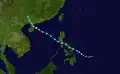 A las 12:00 UTC del día siguiente, la JMA asignó a este sistema como una tormenta tropical, nombrándolo Rumbia;[48] tres horas después lo hizo la PAGASA.[49] Sin embargo, una cizalladura de viento previno un futuro fortalecimiento de Rumbia, y la tormenta permaneció relativamente desorganizada hasta tocar tierra en Samar Oriental cefca del municipio de Hernani City a las 03:00 UTC del día siguiente.[50][51] En ese momento, la tormenta alcanzó un máximo de vientos de 65 km/h y una presión mínima de 1000 hPa.[52] Ya en el Mar de la China Meridional el 30 de junio, Rumbia se organizó, con unas bandas nubosas bien definidas alrededpr del centro. Sin embargo, una cizalladura de viento moderada desplazó a su forma convectiva hacia el suroeste.[53] Al paso del día, imágenes de satélite empezaron a detectar un ojo desarrollado, indicando una intensificación,[54] y a las 06:00 UTC del 1 de julio, la JMA clasificó la intensidad de Rumbia como Tormenta tropical severa; consecuentemente, el ciclón alcanzó su pico de intensidad de vientos en 10 minutos de 95 km/h con una presión mínima de 985 hPa.[55] Tres horas más tarde, la JTWC reclasificó al ciclón como un tifón de categoría uno.[56] Luego, el ciclón tropical se debilitó antes de moverse sobre la península de Leizhou. Debido a que al entrar en contacto con tierra, Rumbia rápidamente se debilitó a un área de baja presión el 2 de julio, y eventualmente se disipó horas más tarde.