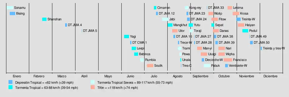 La temporada de tifones del Pacífico de 2013 fue la más activa desde 1994 y la más mortífera desde 1975. La temporada inició con la formación de la tormenta tropical severa Sonamu el 1 de enero; sin embargo, la mayoría de las primeras diecisiete tormentas nombradas antes de la mitad del mes de septiembre fueron relativamente débiles, solo dos de estas alcanzaron la categoría de tifón. El tifón Soulik en julio fue el ciclón tropical más intenso en afectar a Taiwán en 2013. En agosto, el tifón Utor dejó pérdidas económicas en USD $2,6 mil millones y mató a 97 personas, convirtiéndose en el segundo ciclón tropical más mortífero de las Filipinas en 2013. Tres sistemas en aquel mes: Pewa, Unala y Tres-C cruzaron continuamente la línea internacional de cambio de fecha provenientes del Pacífico central y entraron a esta cuenca.