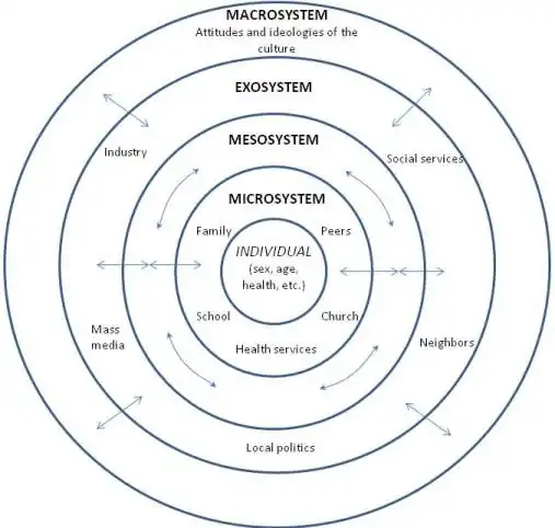Esta teoría expone el desarrollo de la conducta humana, a partir de los niños, dentro de los contextos de los sistemas de relaciones que forman su entorno. Esta perspectiva concibe al ambiente ecológico como un conjunto de estructuras seriadas y estructuradas en diferentes niveles, en donde cada uno de esos niveles contiene al otro. Identifica 5 sistemas ambientales con los cuales interactúa un individuo y proporciona el marco desde el cual los psicólogos comunitarios estudian las relaciones persona-ambiente (contexto): microsistema, el mesosistema, el exosistema, el macrosistema y el cronosistema.[2]