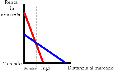 Esto quiere decir que un incremento de la renta; generada bien por el aumento de precio en el mercado, bien por la disminución del coste de producción; provoca un alejamiento de la distancia al mercado, y viceversa.