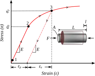 - El material tiene un límite elástico definido como la tensión a la que se produce por primera vez la deformación plástica, es decir, .
