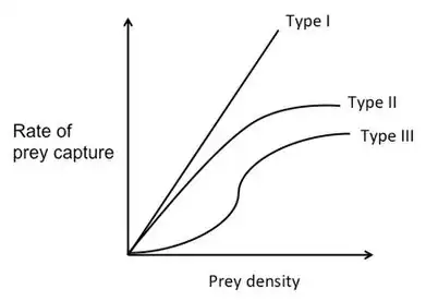 Como se mencionó anteriormente, la cantidad de tiempo que lleva buscar un objeto de presa depende de la densidad de la presa. Las curvas de respuesta funcional muestran la tasa de captura de presas en función de la densidad de los alimentos y se pueden usar junto con la teoría de la dieta óptima para predecir el comportamiento de alimentación de los depredadores. Hay tres tipos diferentes de curvas de respuesta funcional.[15]