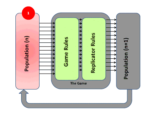 3) En función de esta aptitud resultante, cada miembro de la población se somete a la replicación o el sacrificio determinado por las matemáticas exactas del Proceso de Dinámica del Replicador. Este proceso general produce un P de Nueva Generación (n + 1). Cada individuo sobreviviente ahora tiene un nuevo nivel de condición física determinado por el resultado del juego.