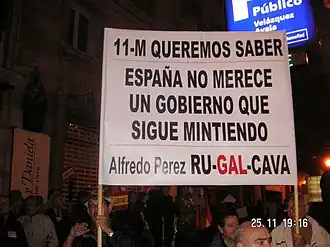 - ↑ Editorial (13 de marzo de 2024). «Veinte años de infamia». El País. «No hay mejor prueba de lo indefendible de la reacción del entonces presidente que la incomodidad mostrada por el PP actual en este aniversario. En ese sentido, es un avance que el líder popular, Alberto Núñez Feijóo, reconociese este martes que su partido “gestionó mal” los atentados.»
