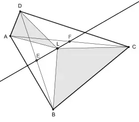 - Sea ABCD un cuadrilátero convexo con diagonales AC y BD, que no es un paralelogramo. Además, sean E y F los puntos medios de las diagonales y L un punto arbitrario en el interior de ABCD. L forma cuatro triángulos con los bordes de ABCD. Si las dos sumas de áreas de triángulos opuestos son iguales ( Área (BCL) + Área(DAL)= Área(LAB) + Área(DLC) ), entonces el punto L está ubicado en la línea de Newton, que es la línea que conecta E y F.