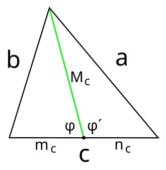 Demostración[2] por medio del teorema del coseno. Sea un triángulo euclidiano cualquiera de lados a, b y c, para cuyo lado c se ha trazado la mediana correspondiente Mc (línea verde en la fig. G&S), donde (por definición de mediana) mc = nc = ½ c. La mediana Mc forma con el lado c los ángulos φ y φ', siendo que φ abarca al lado b y φ' abarca al lado a, entonces de acuerdo al teorema del coseno podemos expresar: