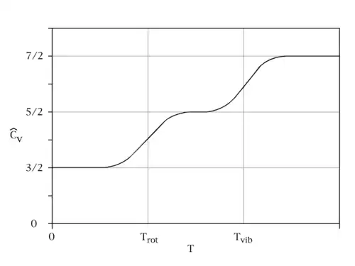 donde p1 y p2 son los momentos de los dos átomos, y q es la desviación respecto a su valor de equilibrio de la distancia de separación inter-atómica. Cada grado de libertad de la energía es cuadrático y, por lo tanto debe contribuir con ½kBT a la energía total promedio, y ½kB a la capacidad calórica. Por lo tanto, el modelo predice que la capacidad calórica de un gas con N moléculas diatómicas es7N · ½kB: cada uno de los momentos p1 y p2 contribuyen con tres grados de libertad, y la extensión q contribuye con el séptimo. De donde se deduce que la capacidad calorífica de un mol de moléculas diatómicas sin otros grados adicionales de libertad debería ser (7/2)NAkB=(7/2)R y, por lo tanto la capacidad calórica predicha debe ser aproximadamente 7 cal/(mol·K). Sin embargo, los valores medidos en laboratorio de las capacidades caloríficas de gases diatómicos son típicamente unos 5 cal/(mol·K)[21] y descienden a 3 cal/(mol·K) a muy bajas temperaturas.[22] Esta falta de acuerdo entre la predicción del teorema de equipartición y el valor experimental de la capacidad calórica molar no puede ser explicado utilizando un modelo más complejo de la molécula, dado que agregar más grados de libertad colo puede aumentar el calor específico predicho, nunca reducirlo.[23] Esta discrepancia fue evidencia fundamental para demostrar la necesidad de desarrollar una teoría cuántica de la materia.