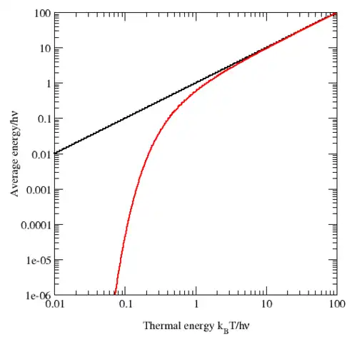 A altas temperaturas, cuando la energía térmica kBT es mucho mayor que el espaciamiento hν entre niveles de energía, el argumento exponencial βhν es mucho menor que uno y la energía promedio es kBT, lo cual está de acuerdo con el teorema de equipartición (Figura 10). Sin embargo, a bajas temperaturas, cuando hν >> kBT, la energía promedio cae a cero — los niveles de energía de altas frecuencias están «congelados» (figura 10). Otro ejemplo es el caso de los estados electrónicos excitados de un átomo de hidrógeno que no contribuyen a su calor específico en el estado gaseos a temperatura ambiente, porque la energía térmica kBT (aproximadamente 0,025 eV) es mucho menor que el espaciamiento entre el nivel de energía electrónico inferior y el próximo nivel de energía electrónico (aproximadamente 10 eV).