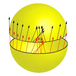 Para el desarrollo algebraico formal de las demostraciones expuestas, se puede tomar, por ejemplo, como un punto corriente de la esfera y el campo de vectores; a continuación se parametriza la esfera en coordenadas polares (suponiendo un radio 1):