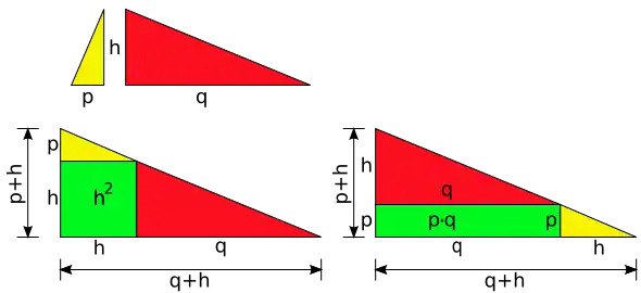 Diseccionar el triángulo rectángulo a lo largo de su altura h produce dos triángulos semejantes (rojo y amarillo), que se pueden suplementar (cuadrado y rectángulo ambos de color verde) y organizar de dos formas alternativas, componiendo dos triángulos rectángulos de mayor tamaño, con lados perpendiculares de longitudes p+h y q+h en ambos casos. Una de estas disposiciones requiere un cuadrado (verde) de área h2 para completarla, y la otra necesita un rectángulo (verde) de área pq. Como ambas disposiciones producen el mismo triángulo, las áreas del cuadrado y del rectángulo deben ser idénticas.