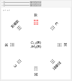 Como son 2-periódicos/8-periódicos, se pueden disponer en un círculo, llamado reloj de periodicidad de Bott y reloj de álgebra de Clifford .