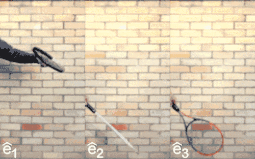 Esto puede ser demostrado con el siguiente experimento: tomar una raqueta de tenis por el mango, con el plano horizontal de la raqueta paralelo al suelo, e intentar girarla en el aire por el eje perpendicular horizontal al mango (e2 en la imagen). En casi todos los casos, la cara realizará media rotación, de modo que ahora la cara que inicialmente estaba hacia el suelo quedará hacia arriba en cuanto se agarre la raqueta nuevamente por el mango. En cambio, es fácil rotar la raqueta sobre el eje del mango sin la rotación adicional alrededor de otro eje; esto es también posible con el eje vertical perpendicular al plano.