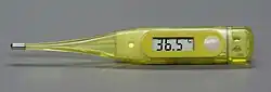 Desde que se dispone de métodos compactos y económicos para medir y mostrar la temperatura, se han utilizado termómetros electrónicos (a menudo llamados digitales, porque muestran valores numéricos). Muchos muestran lecturas con gran precisión (0,1 °C o 0,2 °F, a veces la mitad), pero esto no debe tomarse como garantía de exactitud: la exactitud especificada debe comprobarse en la documentación y mantenerse mediante recalibraciones periódicas. Un típico termómetro electrónico de oído de bajo coste para uso doméstico tiene una resolución de 0,1 °C, pero una precisión declarada de ±0,2 °C (±0,35 °F) cuando es nuevo.[25] El primer termómetro clínico electrónico, inventado en 1954, utilizaba una sonda flexible que contenía un termistor Carboloy.[26]