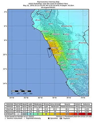 El terremoto de Áncash de 1970, también conocido localmente como terremoto del 70, fue un sismo que tuvo lugar el domingo 31 de mayo de 1970, a las 15:23:31, hora local.[2] Alcanzó una magnitud de 7.9 en la escala de magnitud de momento y una intensidad de grado IX (violento) en la escala de Mercalli.[1] Fue ampliamente sentido en toda la costa y sierra del departamento de Áncash y en regiones limítrofes del sur y norte del Perú. El sismo produjo desprendimiento de un casquete de hielo y rocas del nevado Huascarán, lo que resultó en un aluvión que sepultó la ciudad de Santo Domingo de Yungay, cobrando la vida de aproximadamente treinta mil personas.[3]