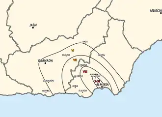 Su magnitud fue de 6,8 a 7,0 en la escala de Richter. Se estima que su epicentro se situó entre la capital de Almería y el valle del Andarax, cerca de Alhama de Almería. Además de los daños ya mencionados en Almería, provocó importantes destrozos en localidades más distantes como Vera, en la provincia de Almería, y Baza, Guadix o Ugíjar, en la provincia de Granada.[4]