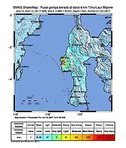 El terremoto de Célebes de 2021 sacudió la regencia de Majene, en la provincia de Célebes Occidental, en la isla indonesia de Célebes el 15 de enero a las 02:28 WITA con una magnitud de momento de 6.2 MW.[2] Este terremoto se sintió tan lejos como Macasar, la capital de Célebes Meridional, y Palu en Célebes Central. Según los informes, también se destruyeron varios edificios en ciudades vecinas, incluido un edificio de tres pisos en Mamuju. Se confirmó la muerte de 105 personas, así como 3 desaparecidos, 3369 heridos y más de 94.000 desplazados.[1] Fue precedido por un sismo premonitor de 5,7 MW unas horas antes.[3]