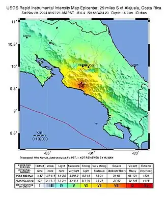 El terremoto se originó a las 02:07 a. m. hora local del 20 de noviembre de 2004. El epicentro se localizó a 40 kilómetros al sursudoeste de San José, capital de Costa Rica. Tuvo una intensidad máxima de VIII en la escala de Mercalli.[1][2][4]