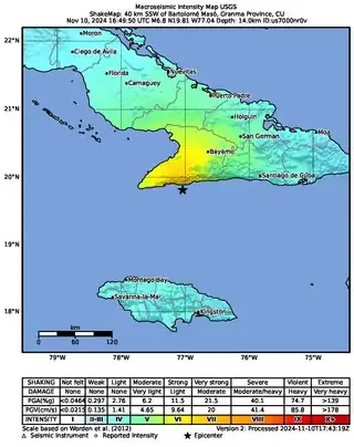 - ↑ «M 6.8 - 40 km SSW of Bartolome Maso, Cuba». Servicio Geológico de Estados Unidos. Consultado el 10 de noviembre de 2024.