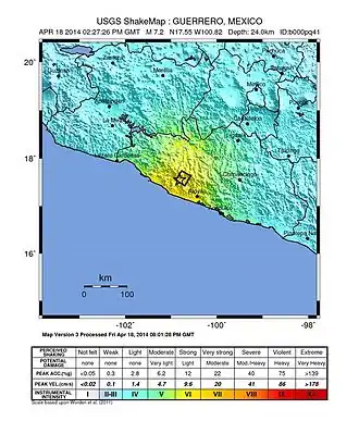 El terremoto de Guerrero de 2014 fue un sismo ocurrido a las 09:27:23 hora local (14:27:23 UTC) del viernes 18 de abril de 2014, que alcanzó una magnitud de 7.2 (MW).[1] Según el Servicio Sismológico Nacional, el epicentro se localizó a 40 km al sur de Petatlán, frente a la región de Costa Grande del estado de Guerrero, en el sur de México. El sismo se ubicó a una profundidad de 11 km bajo la corteza terrestre.[3] Este terremoto de magnitud superior a 7.0 (MW) fue el que más cerca estuvo de la Brecha de Guerrero en 103 años y de la cual no había registrado sismos mayores a 7 grados desde el Terremoto de Guerrero de 1911, hasta el Terremoto de Guerrero de 2021.