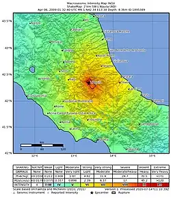 El terremoto de L'Aquila de 2009 fue un sismo de magnitud 6,3 en la escala sismológica de magnitud de momento según el Servicio Geológico de los Estados Unidos[3] registrado el día 6 de abril de 2009 en la zona central de la península itálica.[4] El epicentro se localizó en la ciudad de L'Aquila, región de Abruzo. El terremoto dejó 309 muertos, 1.500 heridos y unas 50 000 personas perdieron sus casas a causa de la destrucción total o parcial de miles de edificaciones.[5][6][7] Las réplicas continuaron los días posteriores del sismo más fuerte, entre ellos varios que superaron magnitud 5,0.