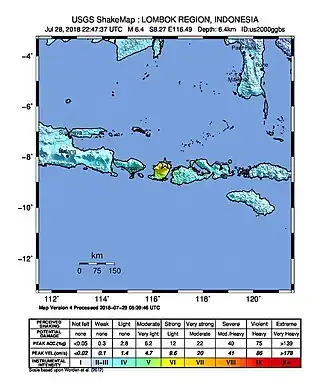 El terremoto de julio de 2018 en Lombok ocurrió en la isla de Lombok en la mañana del 29 de julio de 2018 con una magnitud 6,4 y a una profundidad de 6.4 km.[3] El epicentro se ubicó en el distrito de Sembalun, al este de la regencia de Lombok. Se informó un daño generalizado en el área. Las autoridades confirmaron que 20 personas murieron en el terremoto mientras que cientos de personas resultaron heridas.[2]