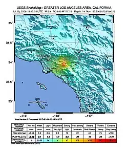Originalmente la magnitud fue estimada en 5.8, o el terremoto más fuerte sentido en California desde el terremoto de Parkfield-San Bernardino de 2004,[3] y el más fuerte en un área urbanizada desde el terremoto de Northridge de 1994.[4]